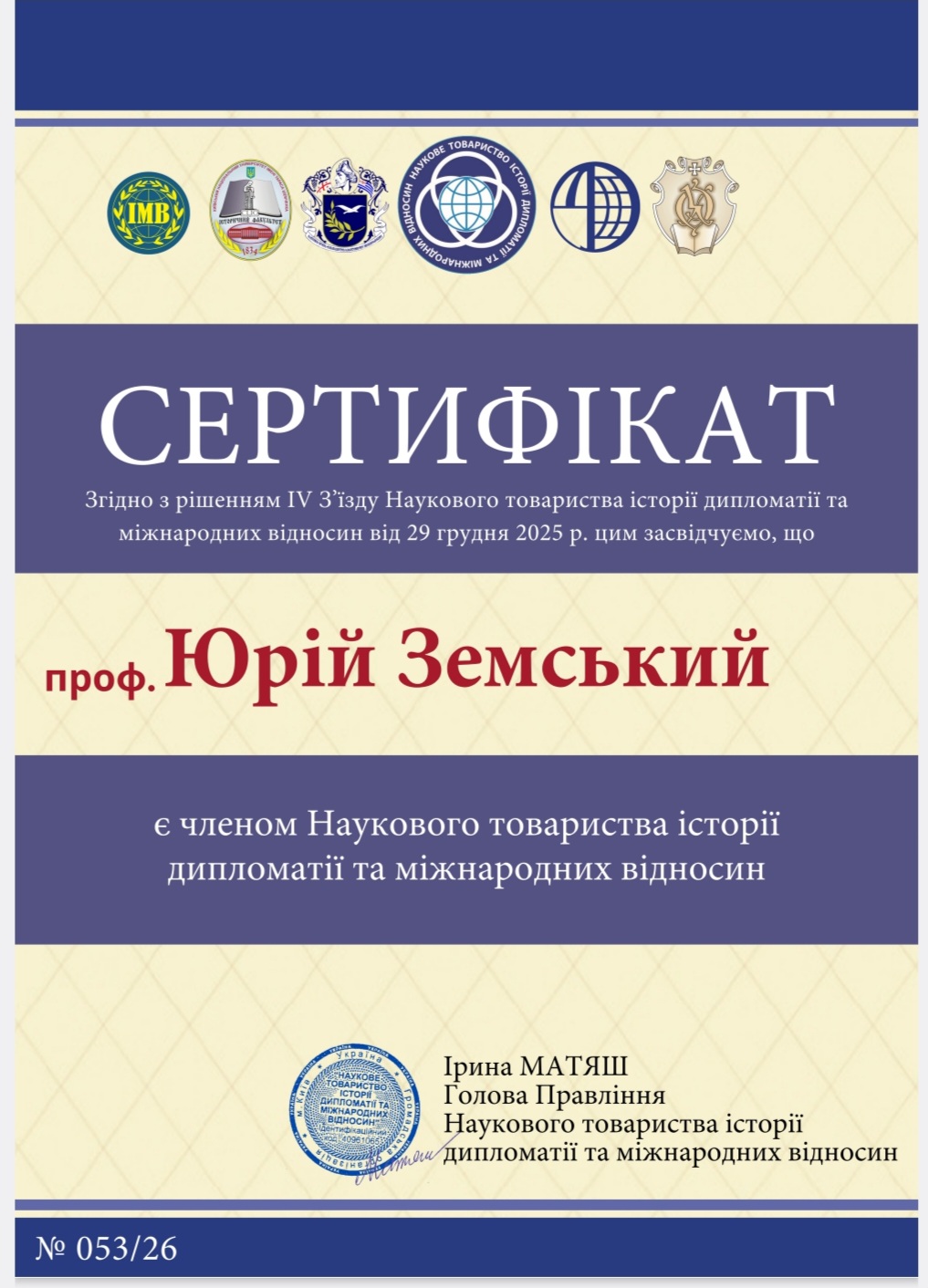 Із 2019 р. член Наукового товариства історії дипломатії та міжнародних відносин.