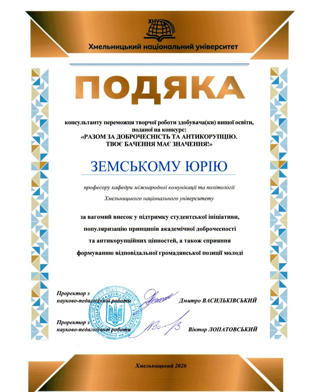 Подяка за вагомий внесок у підтримку студентської ініціативи, популяризацію принципів академічної доброчесності та антикорупційних цінностей, а також сприяння формуванню відповідальної громадянської позиції молоді. Хмельницький національний університет, 2026 р.