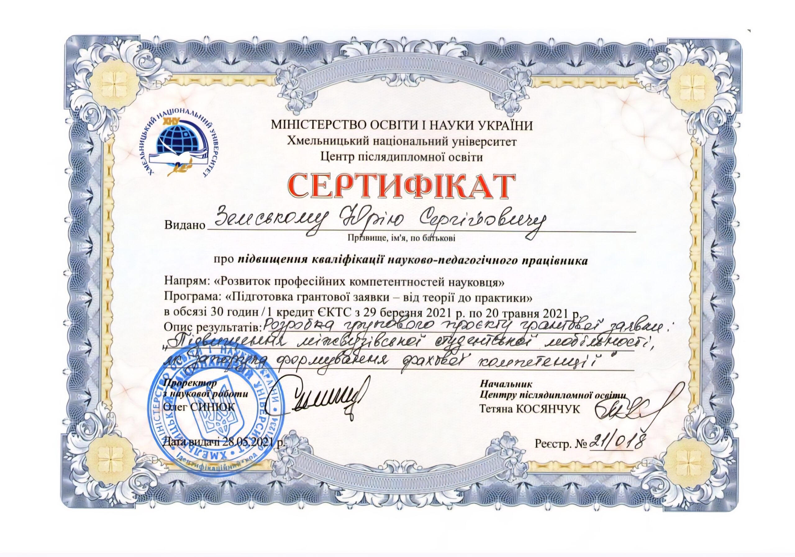 Хмельницький національний університет. Центр післядипломної освіти. Підвищення кваліфікації науково-педагогічного працівника, за напрямом: «Розвиток професійних компетентностей науковця» – 2021